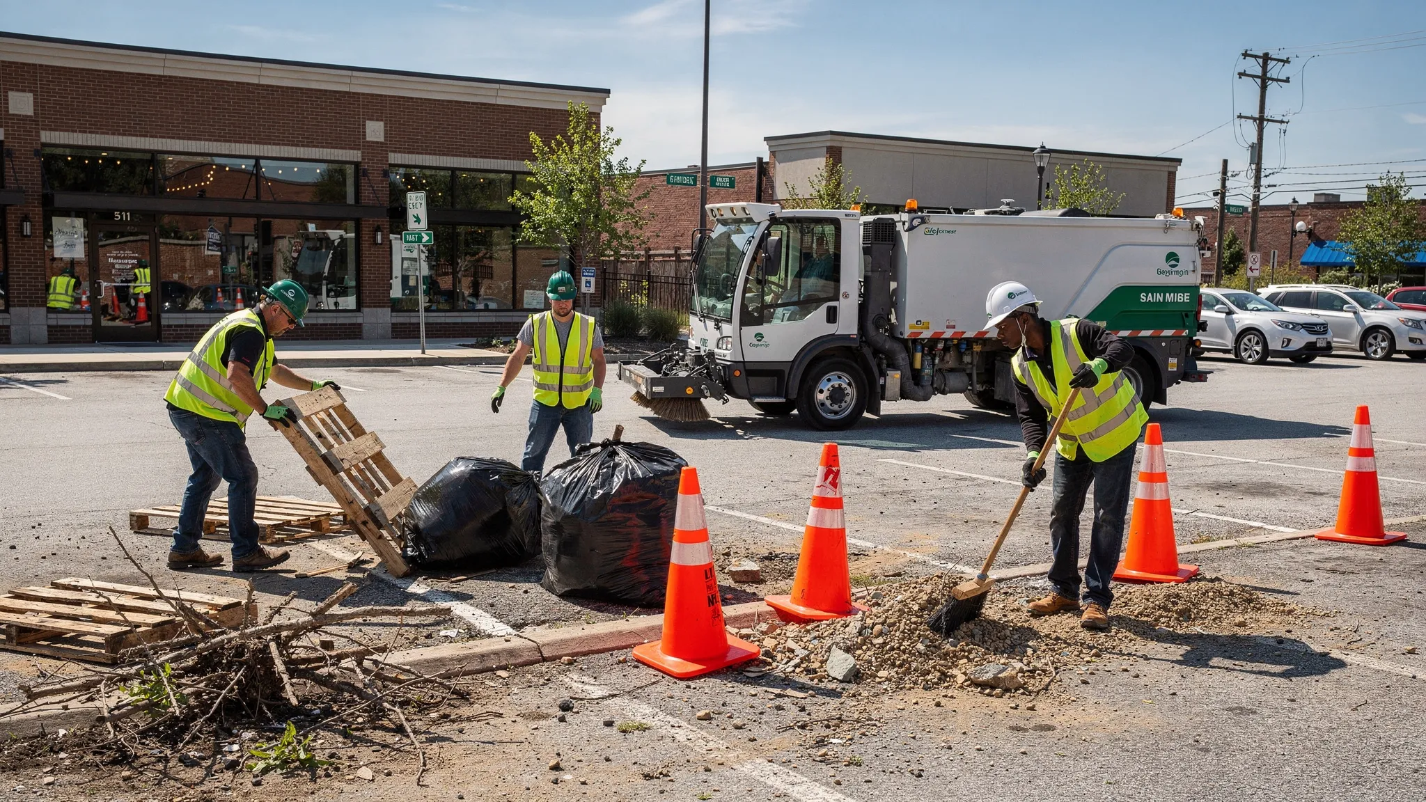 Debris removal often happens where people and vehicles move. Expect basic controls such as cones, spotters when needed, and a plan that keeps the crew out of live traffic as much as possible.